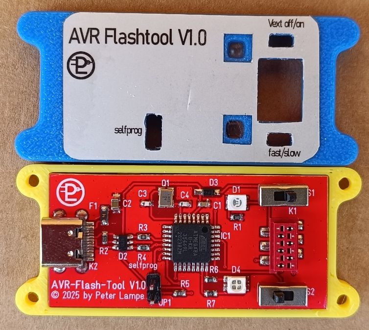 Abweichend vom Original, ist als Eingangsbuchse eine USB-C-Buchse vorgesehen. Als Schutzschaltung wurden spezielle USB-Protektor-Dioden eingesetzt. Die Jumper zur externen Stromversorgung und für den slow-/fast-Mode sind Schiebeschaltern gewichen. Als Progheader habe ich eine 2x3polige Micromatch-Buchse vorgesehen. Ich benutze diese Anschlussvariante in allen meinen Schaltungen. Das ist sozusagen mein privater „Quasistandard“, der sich seit Jahren absolut bewährt hat. Diese Buchse ist deutlich kleiner als die AVR-Standardstecker. Dafür findet sich auf jedem PCB ein Plätzchen.