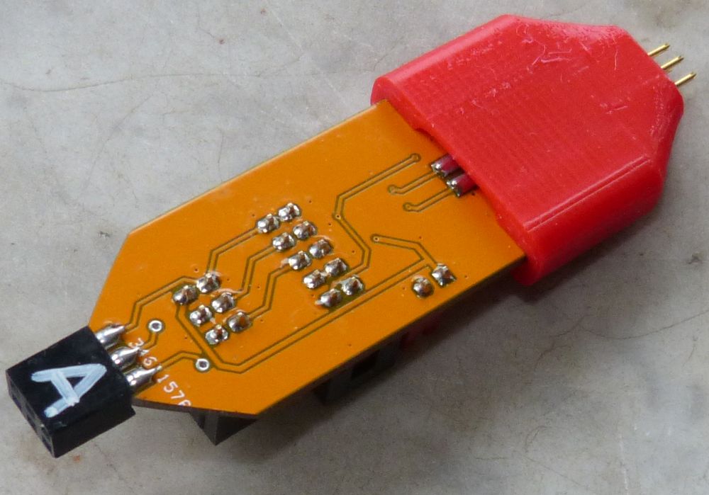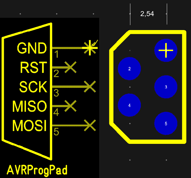 Wenn man auf dem Ziel-PCB nur ganz wenig Platz hat, besteht sogar die Möglichkeit dort ein 5poliges Programmierpad, ohne jegliche Buchsen oder Stecker, vorzusehen. Dass wird dann mit dem Nadeladapter, bestehend aus fünf Pogo-Pins, kontaktiert. Die Zuordnung der Signale und das Footprint ist der Grafik links unten zu entnehmen. Pogo-Pins gibt es mit unterschiedlichsten Nadelformen. Im Prinzip sind alle geeignet, die beim Aufsetzen nicht verrutschen. Ideal sind ganz normale Spitzen. In dem Fall sollte man beim PCB-Design Durchkontaktierungen mit 0,8mm Bohrungen vorsehen, sodass die Nadeln dort einrasten können. Beim Aufbau des Adapters sind die Pogos direkt auf den dafür vorgesehenen Lötpads mittig aufzulöten. Die Die GND-Nadel sollte ca. 1 bis 2mm vorstehen, sodass sie den anderen Nadeln beim Aufsetzen vorauseilt. Um die Anordnung mechanisch zu schützen, habe ich ein kleines 3D-Druckteil entworfen, was über die Pogo-Pins gestülpt und mit der Leiterplatte verklebt wird.