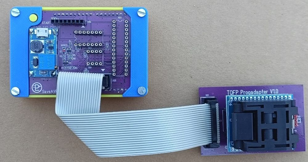 Ausgehend von diesem Board, wurde eine eigene Variante für einen HV-Programmer entwickelt. MCUs im DIL-Gehäuse werden von mir kaum genutzt. Mir war es wichtig, dass auch Controller mit TQFP32-Gehäuse unterstützt werden. Deshalb habe ich die 20pol. Buchsenleiste durch einen Wannenstecker ersetzt. TQFP-Adapter gibt es preiswert über Aliexpress. Dafür habe ich einen separaten Programmieradapter designed. Dieser ist ebenfalls mit dem gleichen Stecker ausgestattet. Die Verbindung erfolgt mit einem Flachbandkabel über passende Pfostenbuchsen. Zusätzlich hat der Adapter noch eine 2x3polige Micromatch-SMD-Buchse. Darüber ist zusätzlich auch noch die ISP-Programmierung, z.B mit dem AVR-Flashtool möglich.