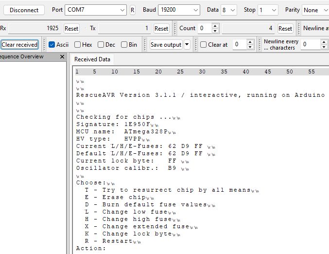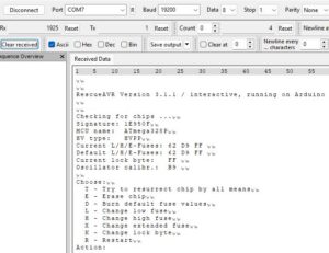 Bei meinen Recherchen bin ich auf bereits vorhandene Lösungen gestoßen. Insbesonder die Variante, die im GitHub-Artikel RescueAVR beschrieben wurde, fand ich sehr gut. Hier wird ein passendes HV-Programmer-Board vorgestellt, das auf einen Arduino Uno aufgesetzt wird. Dieser enthält eine entsprechende Steuersoftware, die von Bernhard Nebel und Jeff Keyzer geschrieben wurde. Damit kann man über ein Terminalprogramm, die betroffenen MCUs wieder in deren Ursprungszustand zurückversetzen. Das Board funktioniert prima und ich möchte an dieser Stelle „felias-fogg“ meinen Dank aussprechen.