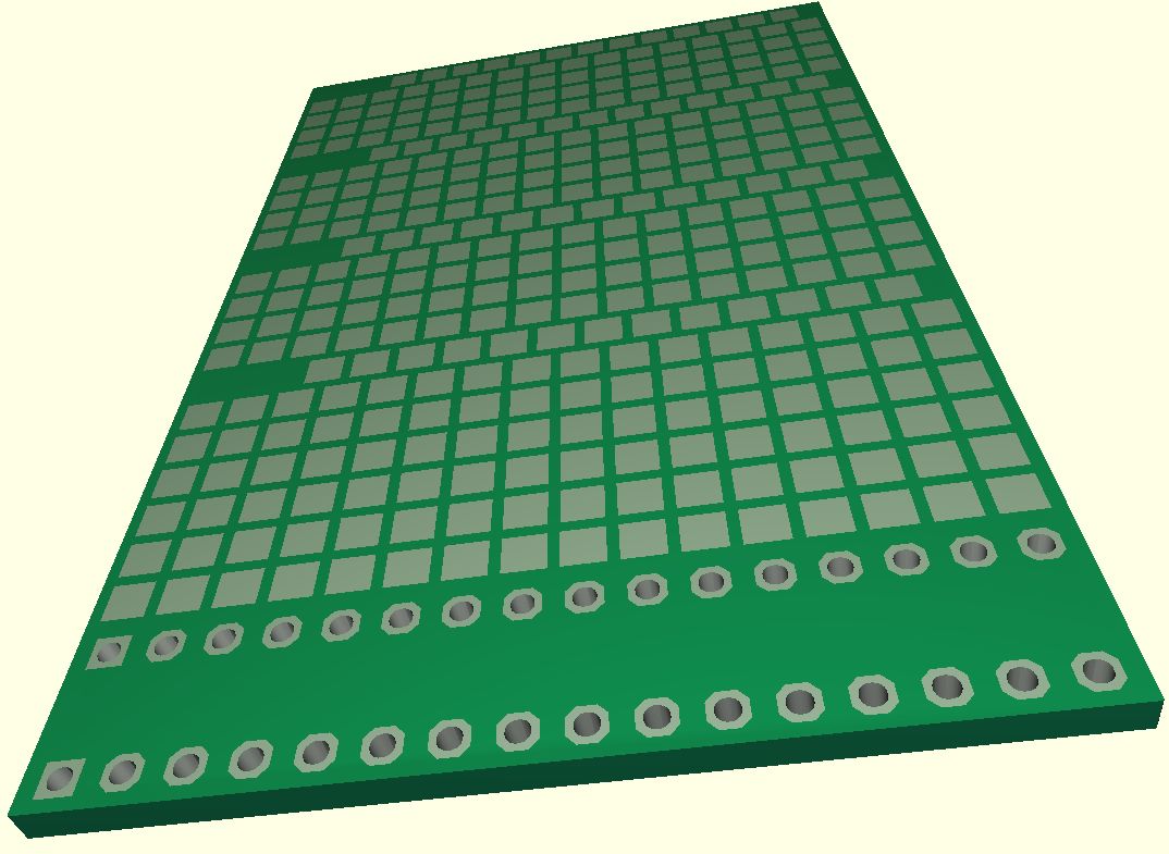 Das einfachste aber sehr nützliche Erweiterungsmodul ist diese Universalleiterplatte für SMD-Bauelement. Sie besteht nur aus SMD-Pads, die teilweise verbunden sind aber bei Bedarf mit einem Cutter aufgetrennt werden können. Des Weiteren sind manche Reihen versetzt angeordnet. Das ermöglicht das Einlöten von  SOT23-Gehäusen.