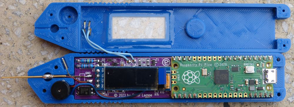 Ein Raspberry Pi Pico ist das Herzstück des Testgeräts. Aufgrund seines extrem flachen Aufbaus und seiner Abmaße von nur 51mm x 21mm lässt er sich ideal in einen schmalen Prüfstift integrieren. Die gesamte Schaltung findet auf einem PCB von 100mm x 22mm Platz. Das Gehäuse besteht aus  zwei Halbschalen, die als 3D-Druckteile gefertigt werden. Das Displayfenster ist ein Frästeil aus Plexiglas.