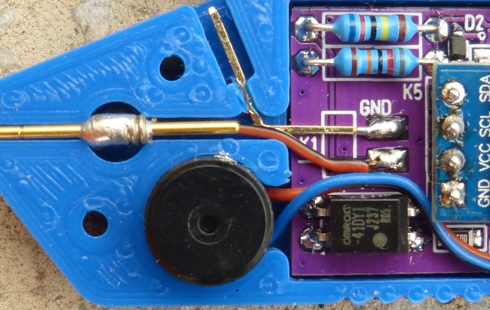 Nun muss noch der Buzzer in die dafür vorgesehenene Aufnahme eingepasst werden. Die bereits eingelöteten Drähte sind dazu einzukürzen und an den Anschlüssen anzulöten.