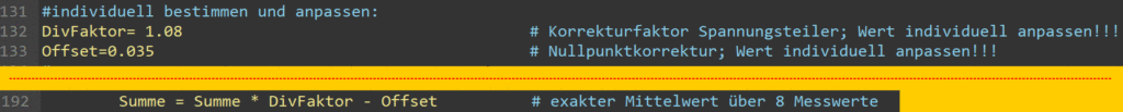 Als Nächstes wird der Verstärkungsfaktor angeglichen. Der Teilungsfaktor des Eingangsspannungsteilers ist nicht exakt 8:1. Bei R1=6,2MOhm und R3=820kOhm wird eine rechnerische Spannungsteilung von 8,561….. erreicht. Hinzu kommen noch Bauelementetoleranzen, die sich ebenfalls auf den Teilungsfaktor auswirken. Deshalb habe ich den Korrekturfaktor DivFaktor eingeführt, der alle diese Einflüsse berücksichtigt. Er korrigiert zusammen mit Offset das ADC-Ausgangsignal, aus dem letztendlich der angezeigte Wert im Display errechnet wird. Dazu ist folgendermaßen vorzugehen.