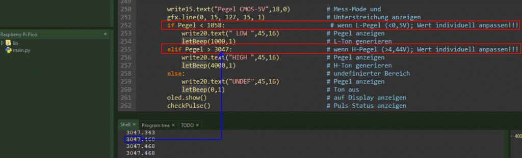 Letztendlich müssen die Schwellwerte für die Pegel beider Logiksysteme genau eingestellt werden. Die Vorgehensweise ist für TTL/VTL und CMOS-5V absolut identisch. Lediglich die einzutragenden Werte unterscheiden sich. Ich möchte die Vorgehensweise am Beispiel des HIGH-Schwellwertes bei CMOS-5V erläutern. Der ist laut Definition >=4,44V. Bei gleichem Kalibrieraufbau, wie bei der Spannungskalibrierung, werden 4,44V am Netzteil eingestellt. Der Multitester wird mit der Sensortaste in den Modus CMOS-5V geschaltet. Im THONNY-Editor bewegt man sich zum entsprechenden Quelltextabschnitt. Dort gibt es eine if-elif-Anweisung, in der die Schwellwerte, so wie sie vom ADC erfasst werden, zugeordnet werden müssen. Unterhalb des Editorfensters, werden im Terminalbereich die Messwerte angezeigt. Der Wert vor dem Komma muss dann einfach oben eingetragen werden. In meinem konkreten Fall ist das 3047 für den HIGH-Schwellwert. Mit dem LOW-Eintrag ist in der gleichen Weise zu verfahren. Die Prozedur für TTL/VTL ist analog.