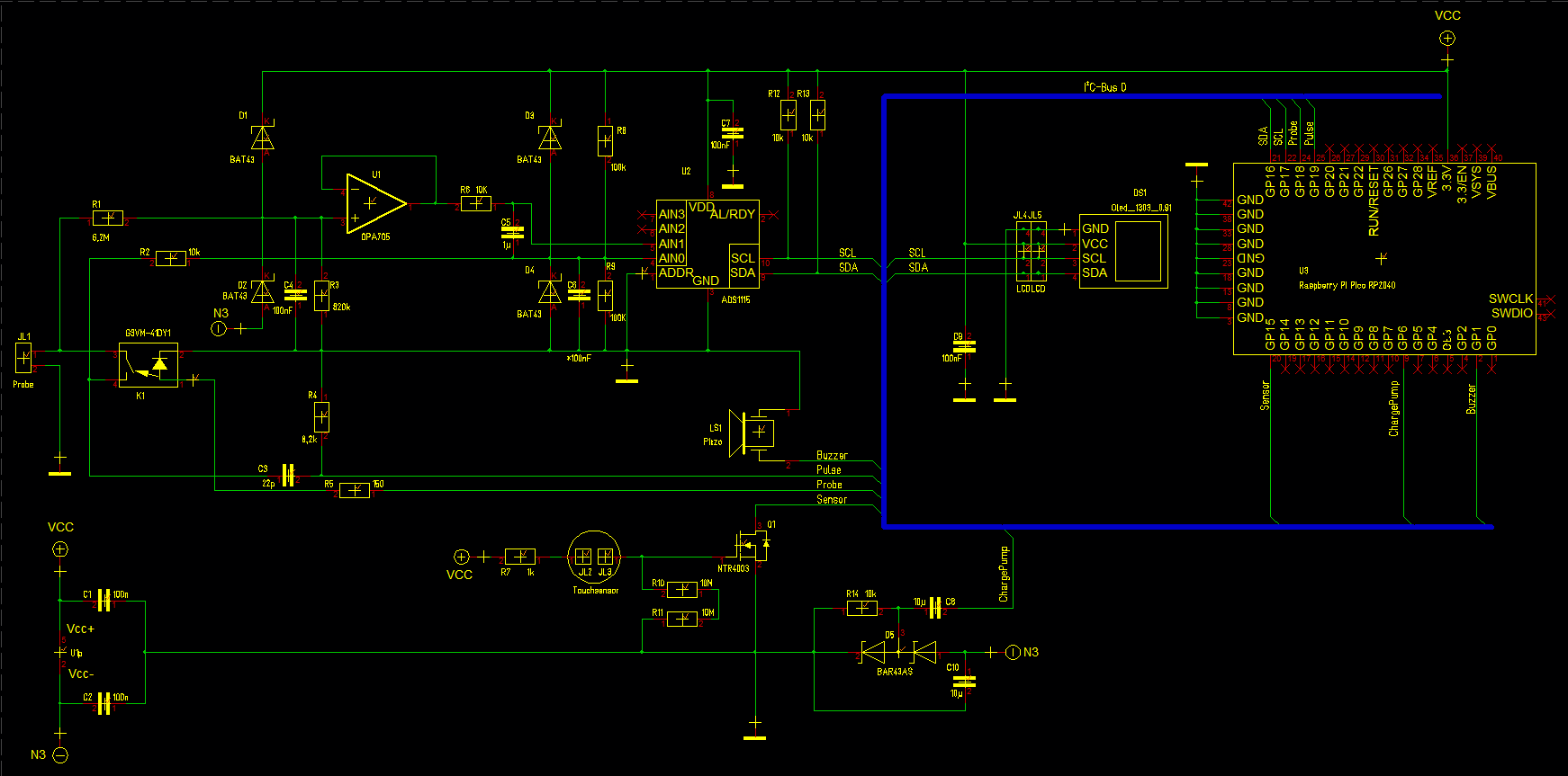 Ich möchte an Hand der nebenstehenden Schaltpläne die Funktionsweise des Gerätes erläutern. Wie bereits angedeutet, erfolgt die Steuerung des Prüftifts durch einen Raspberry Pi Pico. Über dessen Micro-USB Buchse erfolgt auch die Betriebsspannungszuführung. Hier kann entweder ein USB-Anschluss eines PCs verwendet werden oder ein separates Netzteil. Die Grafikanzeige übernimmt ein OLED-Display mit einem SSD1306-Treiber. Der Datenaustausch erfolgt über I²C. Ebenfalls an diesem Bus hängt ein ADS1115. Dieser 4-fach-ADC hat gegenüber den eingebauten ADCs der MCU nicht nur den Vorteil, dass er mit 16bit eine bessere Auflösung hat, auch die Linearität ist deutlich besser. Von diesem ADC werden zwei Kanäle verwendet.